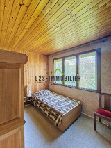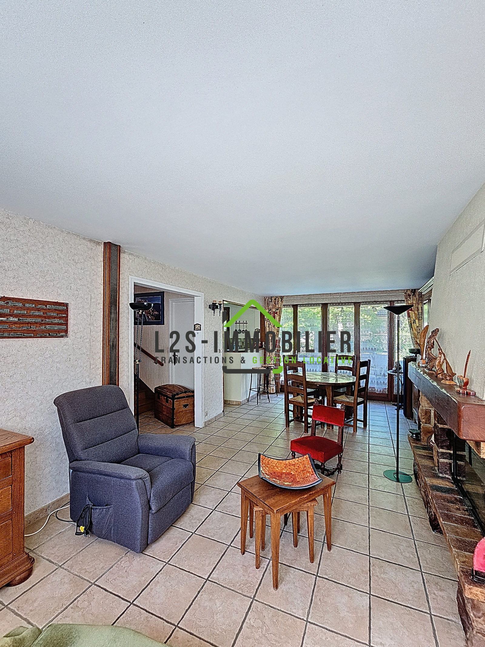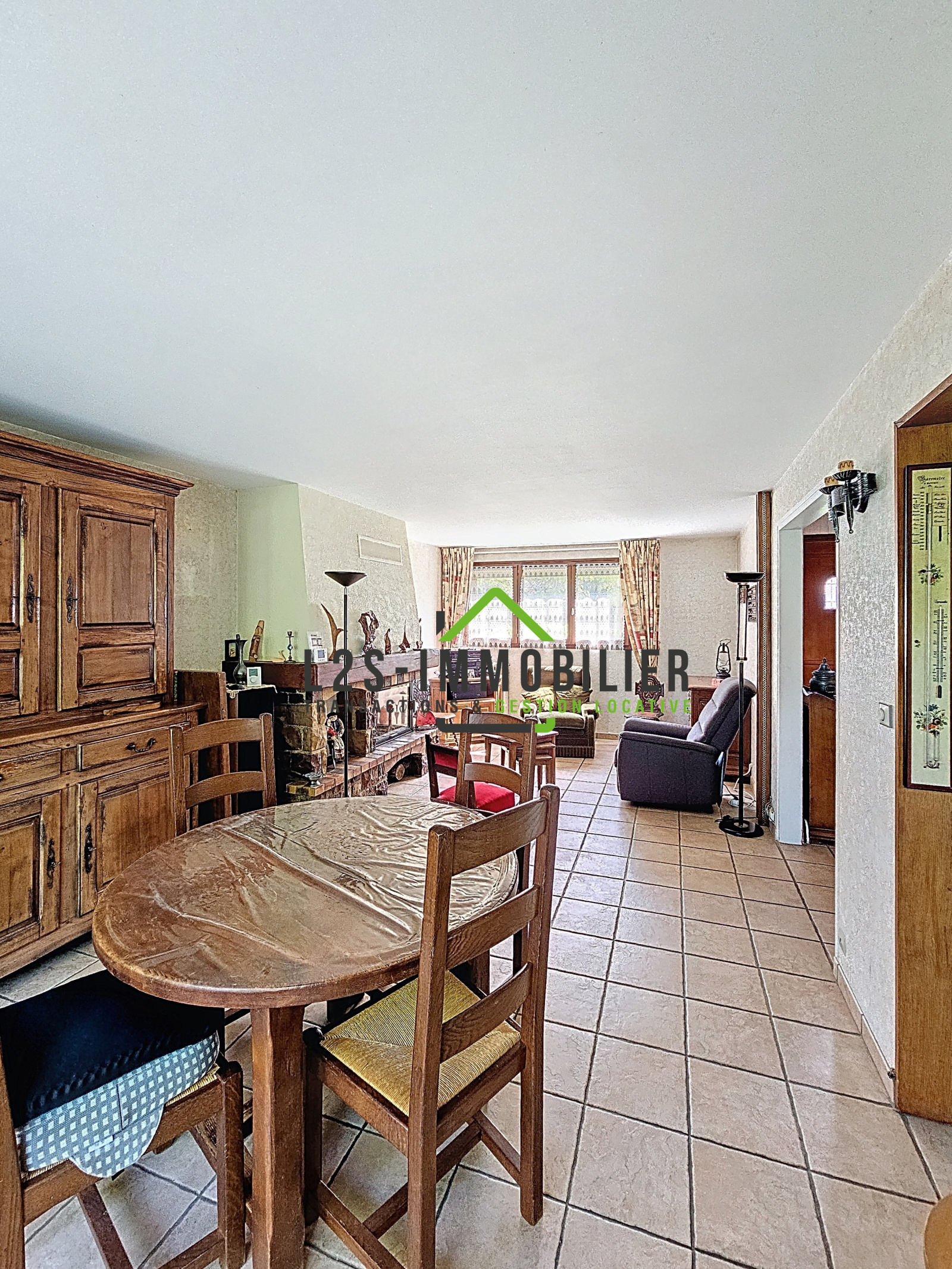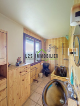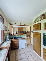 Entrée, wc avec lave mains, douche, séjour/salle à manger avec cheminée, cuisine meublée.